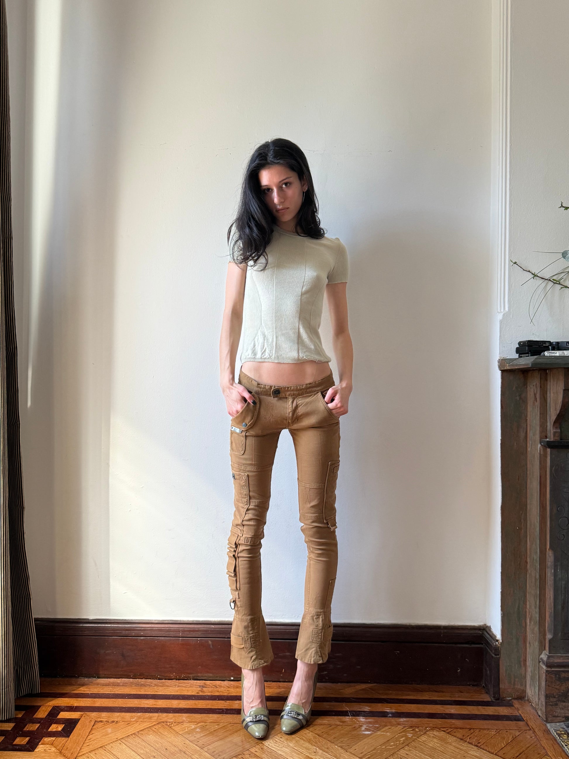 Rare Chanel knit top in a soft pastel green colorway, crafted from a luxurious cashmere and silk blend. This elevated piece showcases refined craftsmanship with a fitted, body-skimming silhouette.