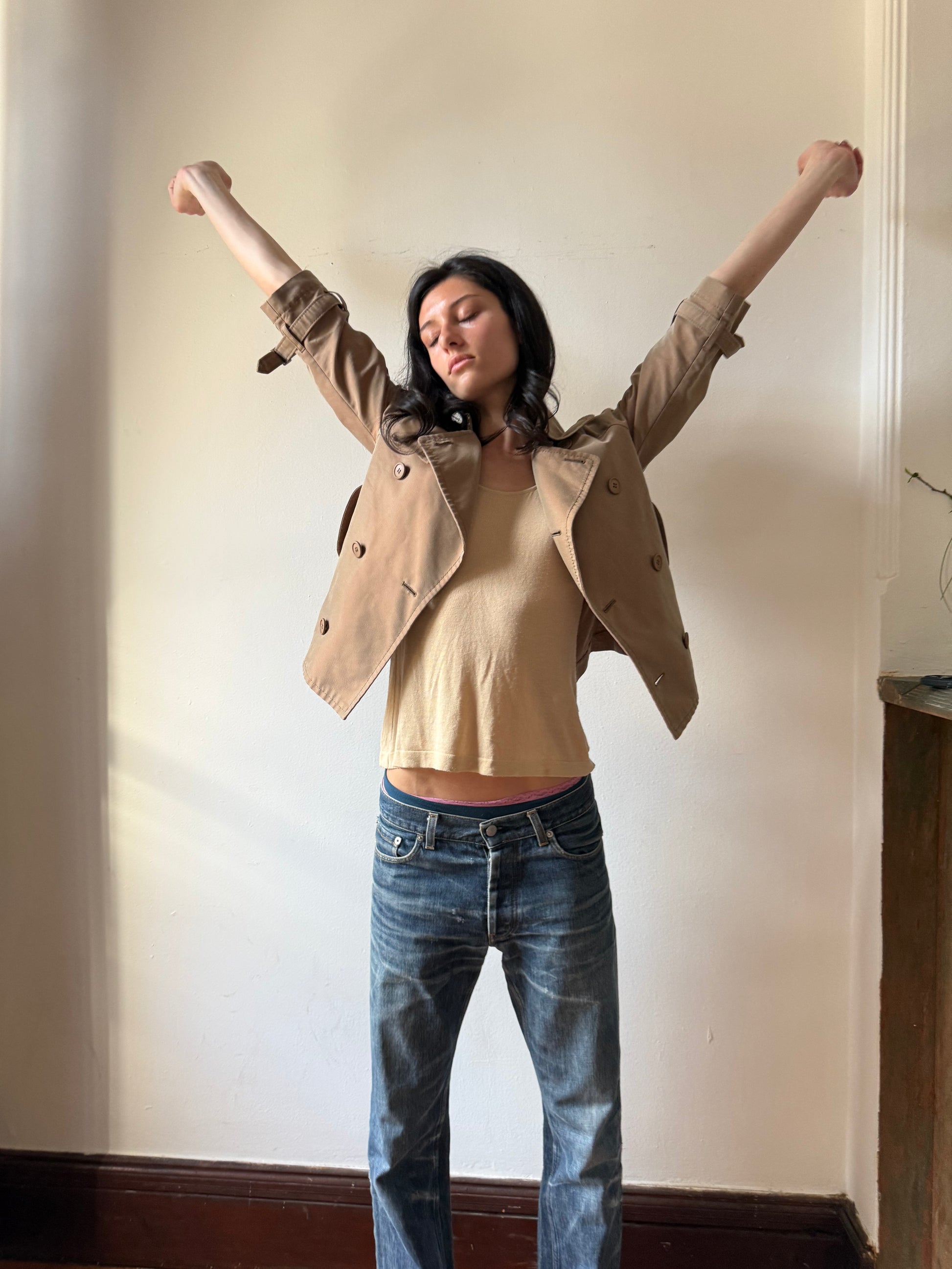 Cut in a cropped trench-inspired shape, it features a structured collar, classic back storm flap, and asymmetric front overlap for a layered, architectural look. Two envelope-style side pockets add functionality while maintaining a clean, minimal design.
