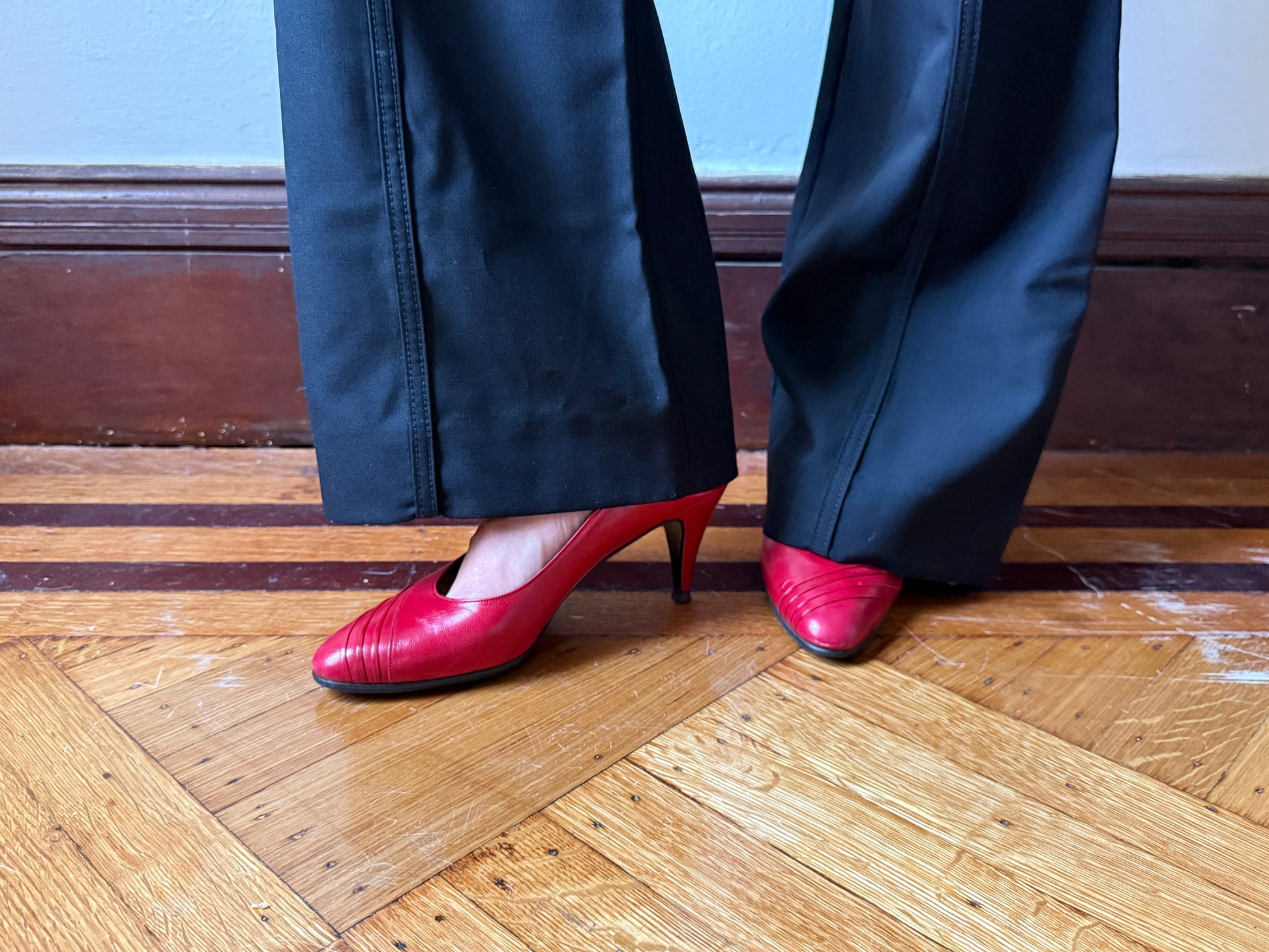 Stunning vintage Céline heels in a bold red hue, embodying a distinct 1980s-inspired silhouette with elegant, feminine detailing. The design is elevated by a beautifully sculpted toe featuring four delicate, asymmetrical pleats that add dimension and visual interest.